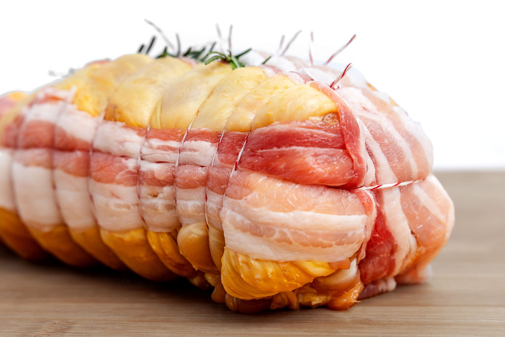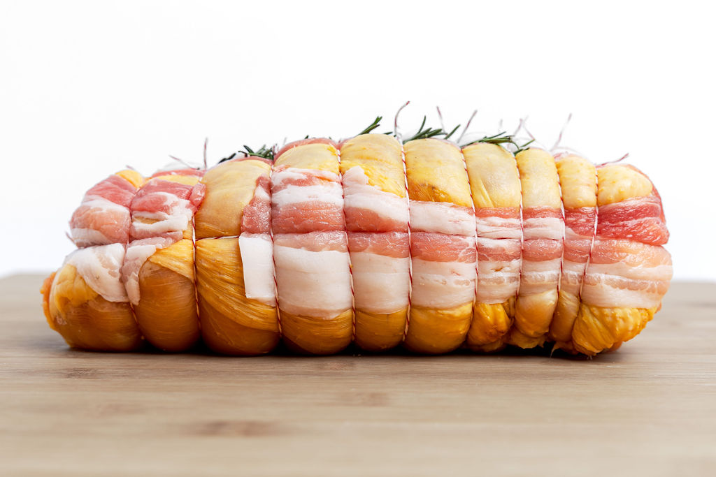 Pollo disossato farcito con impasto di polpette. Artigianale, ricco di sapore e pronto da infornare.