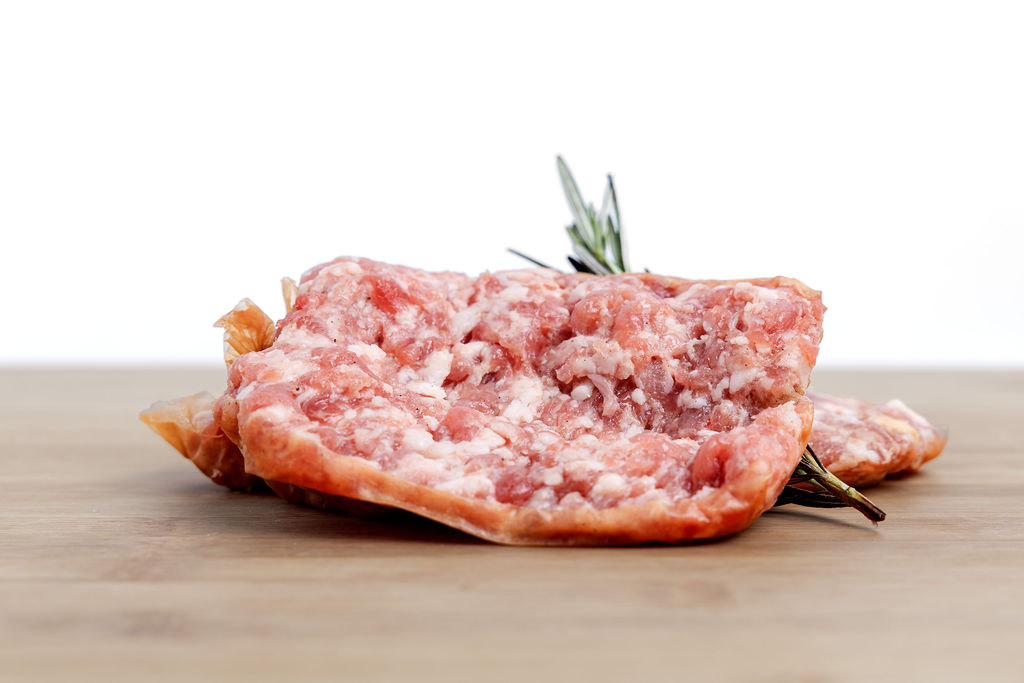 Ingredienti: coscia coniglio 80%, suino 20%, sale, pepe.